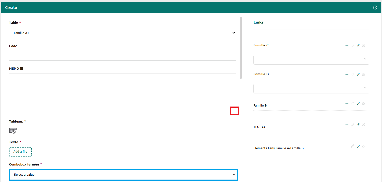 - MEMO/TEXT: a larger text than EDIT/TEXTE, with a string of 500 or 4000 characters depending on the configuration.