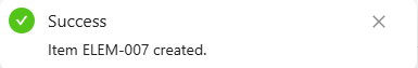 After clicking on “Create”, the form is automatically closed and the record appears in the main grid. An element creation confirmation appears in the top left-hand corner of the main grid.
