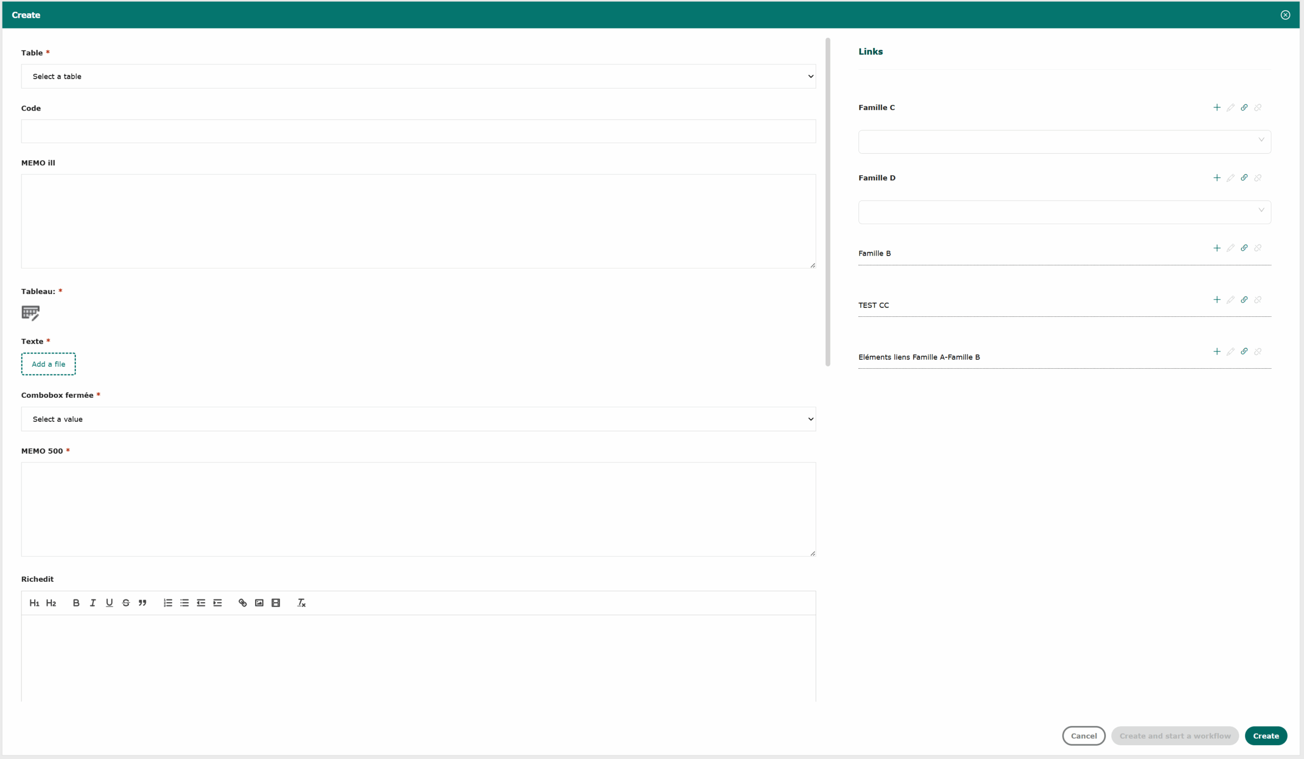 The creation of a record is subject to the management of the connected user’s rights. If you do not have the rights defined in the administrator interface, the creation icon will be grayed out.