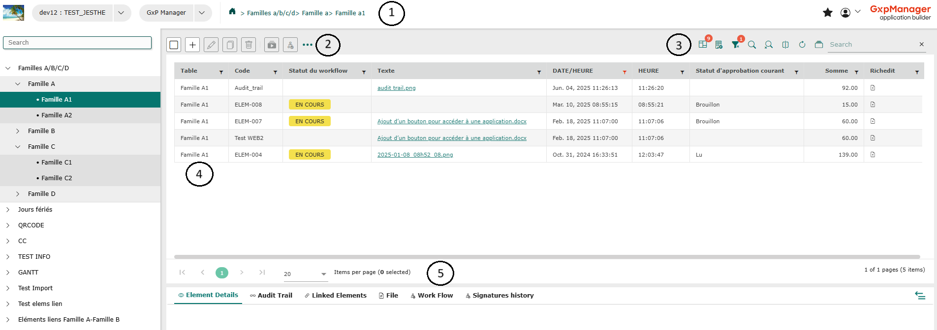 Clicking on a family/table in the left-hand menu opens the associated grid. A grid is a table in which each row corresponds to a record. The fields relating to this record are arranged in columns.