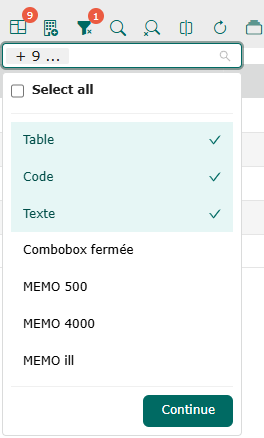 • Show and hide columns using the “Select visible columns” icon: check the column labels to add them to the grid, or uncheck them to hide them from the grid. Confirm by clicking on “Continue”.