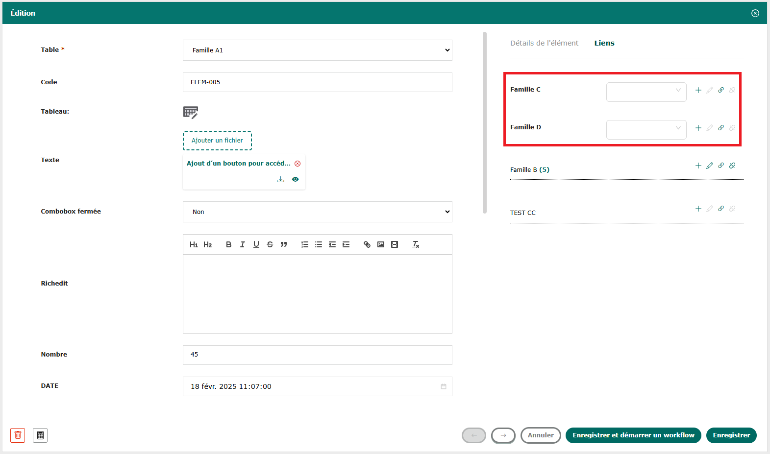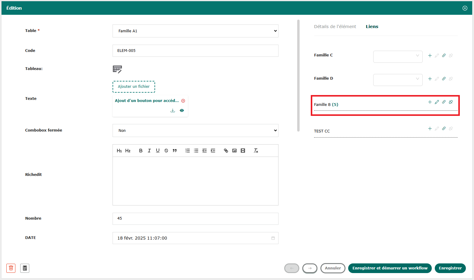 Le lien de composition inverse est similaire à un lien de traçabilité en gris clair dans la partie basse à droite du formulaire. Plusieurs éléments d’une autre table composent cet enregistrement. Comme pour un lien de traçabilité, il aura un nombre précisant combien d’enregistrements sont liés.