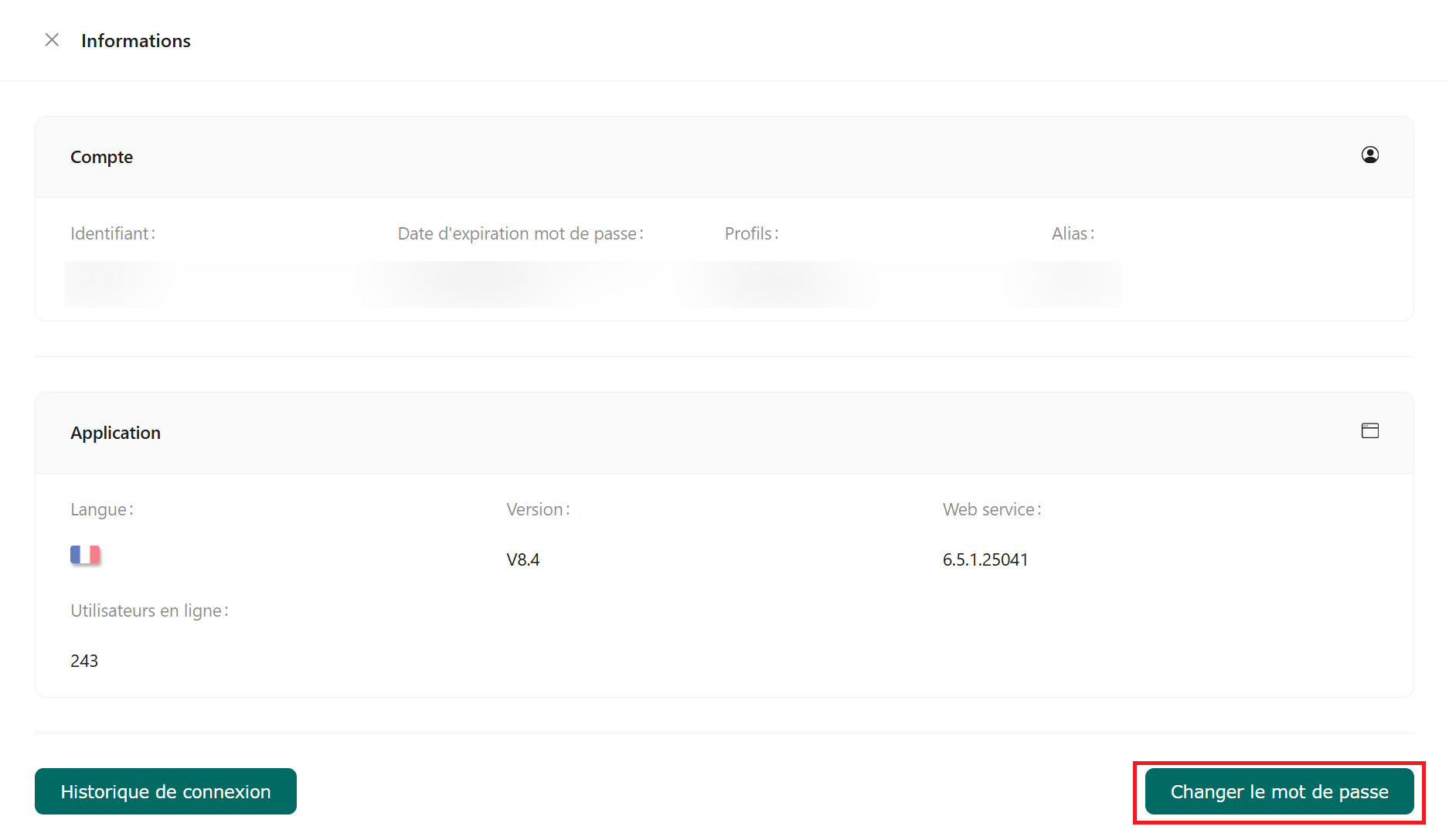 • Ouvrez le menu utilisateur en haut à droite dans le header de l’application. Cliquez sur « Informations ».