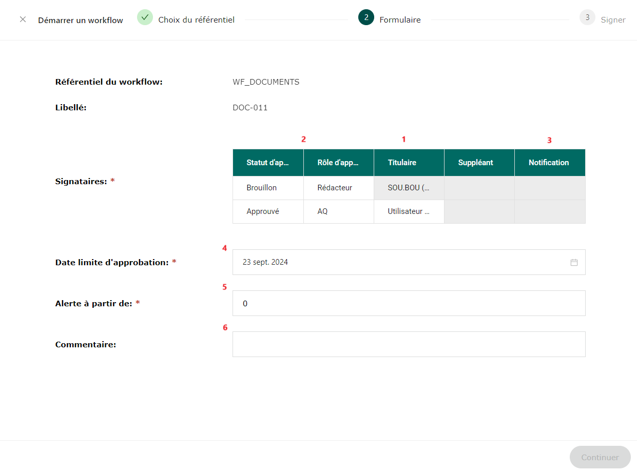 Si les champs liés aux signataires ne sont pas complétés un message indique que les champs sont obligatoires. Si cette étape n’est pas complétée il n’est pas possible de valider et initier le workflow, le bouton « Continuer » est grisé.