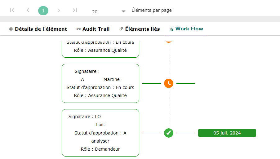 Vous pouvez également visualiser l’état du workflow via l’écran du bas dans l’onglet Workflow, après avoir sélectionné un enregistrement.